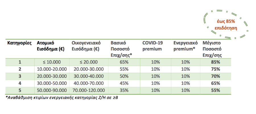 - Το ποσοστό ενίσχυσης μπορεί να φτάσει μέχρι το 85% του συνολικού προϋπολογισμού εργασιών και κλιμακώνεται ανάλογα με το ύψος του εισοδήματος.